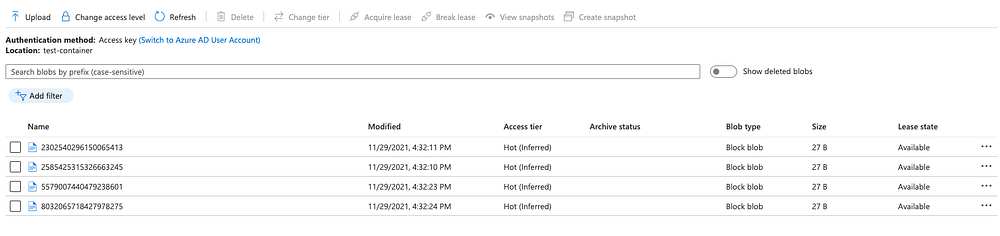 Go to the Azure resource group (rg-test-containerapps by default) and check for blobs in the test-container. You should see at least 2 files. Refreshing the URL will generate additional files.