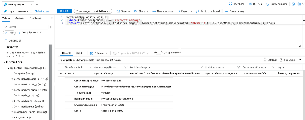 | project ContainerAppName_s, ContainerImage_s, format_datetime(TimeGenerated, "hh:mm:ss"), RevisionName_s, EnvironmentName_s, Log_sSo how does it work?