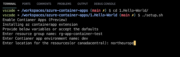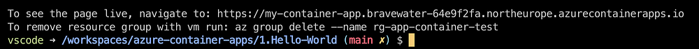If you want to practice along, I’ve created a repo with a devcontainer set up covering 2 separate scenarios. The first scenario located in the folder 1.Hello-World will deploy a sample "hello world" web app and expose the endpoint as internal ingress. The second scenario uses bicep to deploy additional configuration and showcase usage of secrets in the container app.
