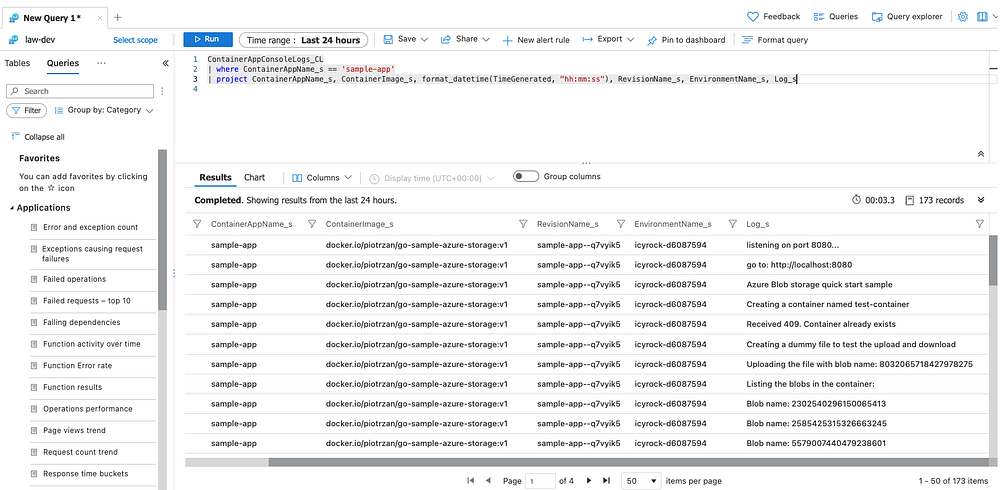 From there we can execute a simple query to read the stdin logs from the sample app: