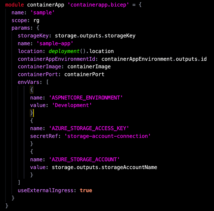 If you look closely at the bicep template, you can see that it defines an envVar array with configuration and secret references. If you are familiar with Kubernetes, this is how secrets are referenced in a pod spec. Remember that bicep is just a superset of ARM JSON, so it has all the fields exposed by Container App API.