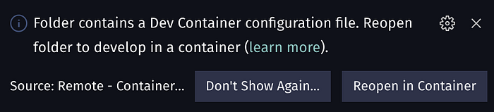 If the prompt does not appear, you can use F1 or Ctrl+Shift+P and select Reopen in Container.