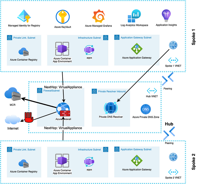 However this empowerment is only helpful if a mature cloud organisation can ensure the fully private network integration of multiple Azure Container App Environments at scale without needing to restrict developer teams again.